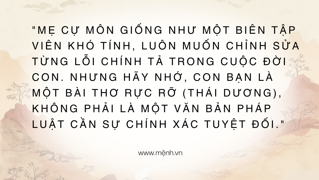 Con bạn là Mặt Trời (Thái Dương), bạn là Đám Mây (Cự Môn). Mây có thể tô điểm cho hoàng hôn thêm rực rỡ, nhưng mây cũng có thể che khuất ánh sáng. Hãy là đám mây lùi lại phía sau, làm nền cho con tỏa sáng, thay vì trùm lên đời con bằng những nỗi lo âu và xét nét của mình.