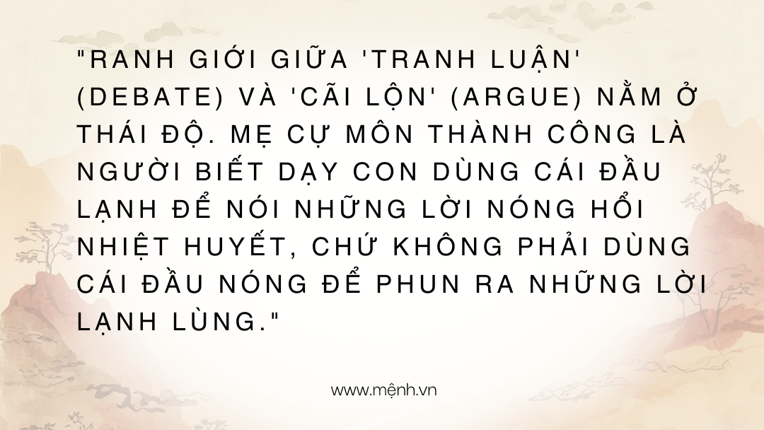 Nếu Liêm Trinh là bà mẹ "Kỷ luật thép" (Tiger Mom) rèn con vào khuôn khổ, thì Cự Môn hoàn toàn khác. Bạn không dùng roi vọt hay mệnh lệnh áp đặt. Vũ khí giáo dục của bạn là Lời Nói và Tư Duy Phản Biện.
