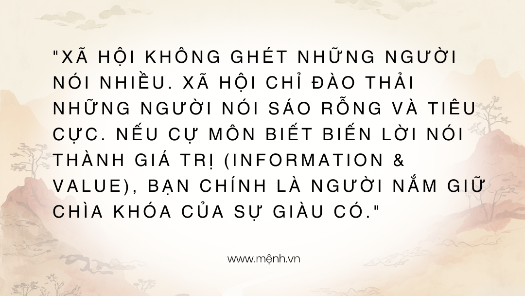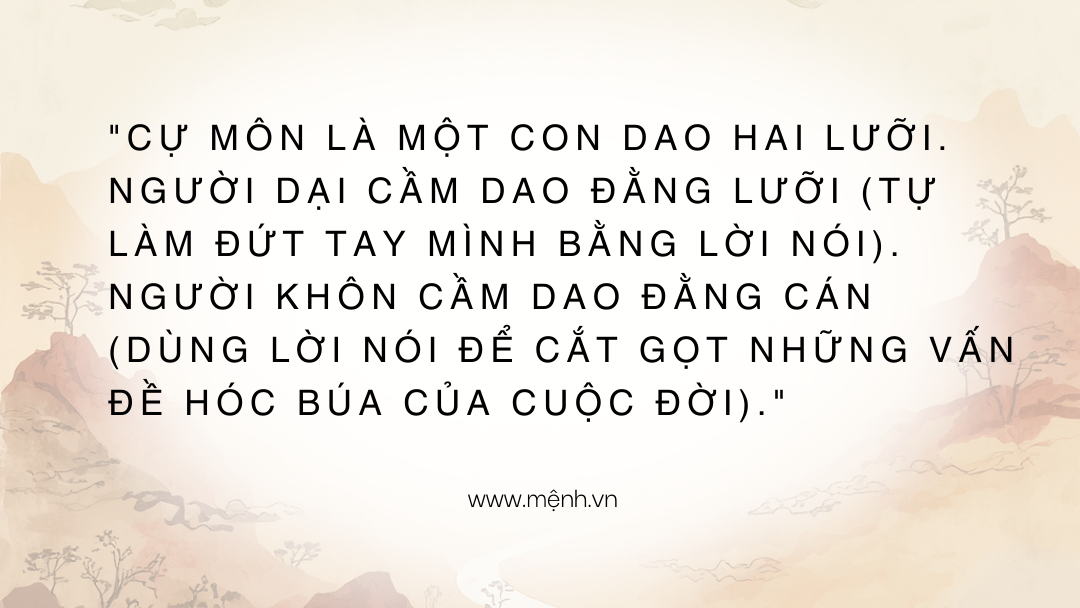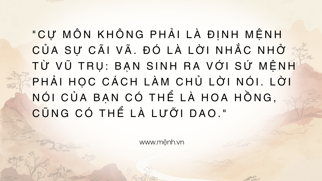 Lá số Cự Môn trao cho bạn một vũ khí sắc bén là Ngôn ngữ và Tư duy phản biện. Việc bạn dùng nó để trở thành một Diễn giả, Luật sư, Chuyên gia đắt giá hay trở thành một "bà cô" hay ngồi lê đôi mách... hoàn toàn phụ thuộc vào cách bạn "vặn nút âm lượng" của cuộc đời mình.