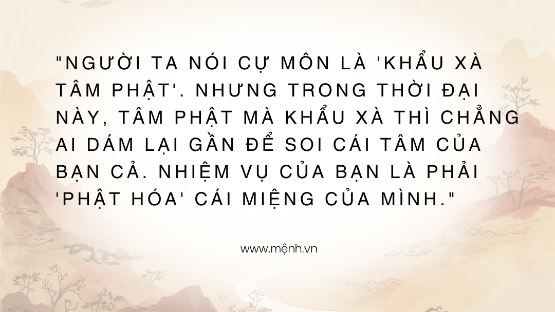 - Tu Khẩu (Kỷ luật lời nói): Trước khi nói, hãy tự hỏi: "Lời này có đúng không? Có cần thiết không? Có gây tổn thương không?". Nếu không, hãy im lặng. Im lặng cũng là một dạng ngôn ngữ quyền lực.