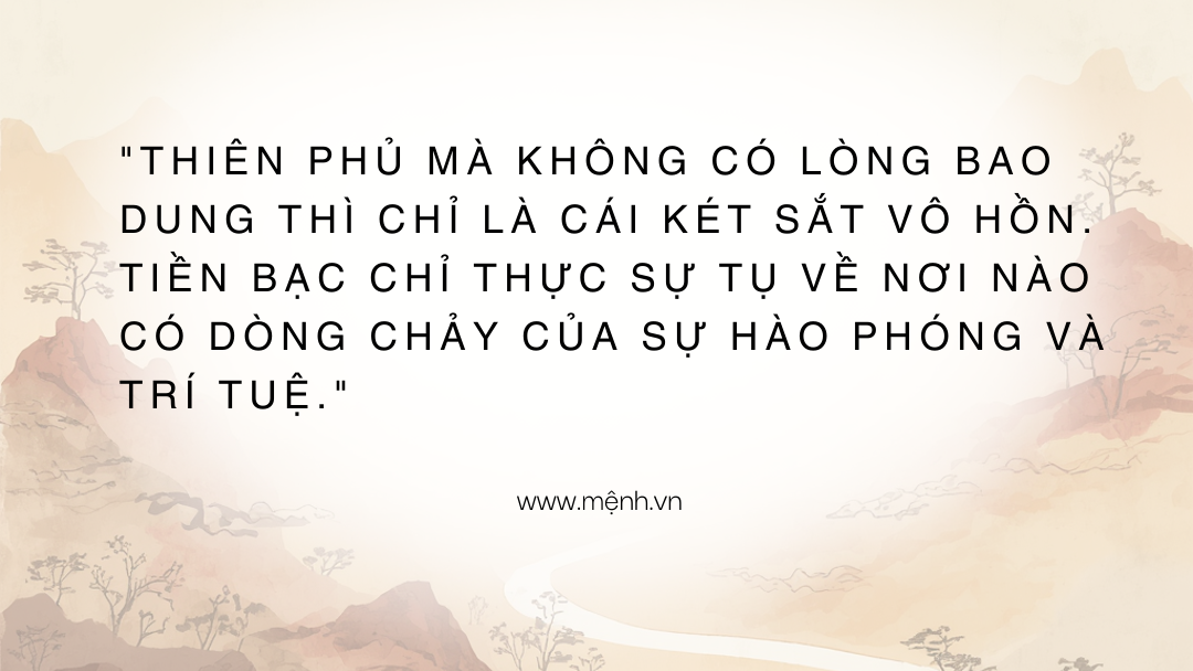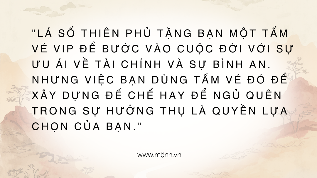 - Học cách "Cho đi" (Give & Gain): Bản năng của Thiên Phủ là "Thu vào" (Tích trữ). Hãy tập thói quen làm từ thiện hoặc chia sẻ kiến thức. Dòng tiền phải luân chuyển thì cái Kho mới không bị ẩm mốc.