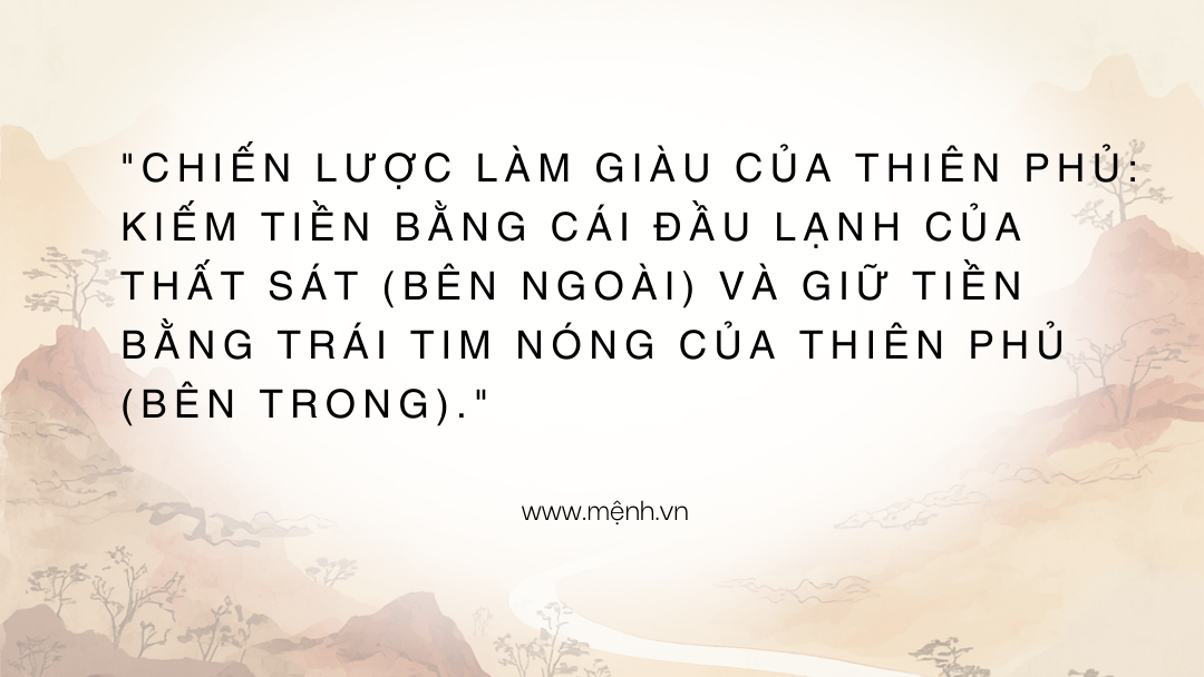 - Tư duy "Cash is King": Bạn thực tế (đôi khi thực dụng). Bạn không tin vào những chiếc bánh vẽ. Với Thiên Phủ, tài sản phải nhìn thấy được, sờ thấy được (Nhà đất, vàng, tiền mặt). Bạn ghét rủi ro và sự mạo hiểm.